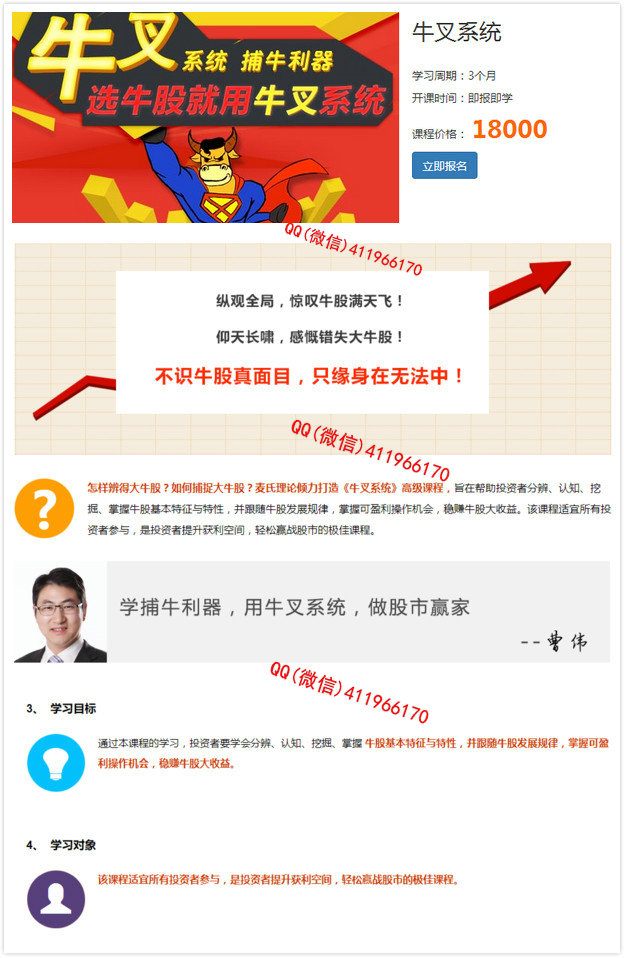 怎样辨得大牛股?如何捕捉大牛股?麦氏理论倾力打造《牛叉系统》高级课程,旨在帮助投资者分辨、认知、挖掘掌握牛股基本特征与特性,并跟随牛股发展规律,掌握可盈利操作机会,稳赚牛股大收益。该课程适宜所有投资者参与,是投资者提升获利空间,轻松赢战股市的极佳课程。